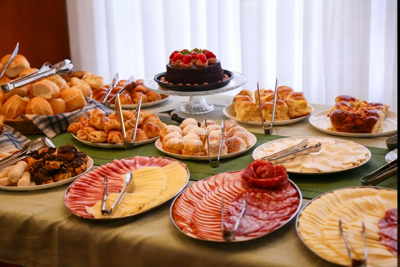 Todas as manhãs na Pousada Donna Bella começam com um buffet generoso, montado em um salão claro e acolhedor, que reúne o melhor dos sabores caseiros: