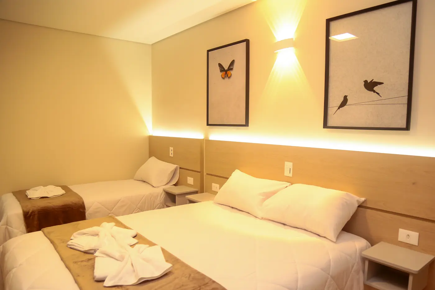 As suítes são modernas e equipadas com: tranca digital, TV 4K, ar-condicionado, frigobar, secador de toalhas, ducha moderna, Wi-Fi, tomadas e carregadores USB na cabeceira para máxima praticidade.